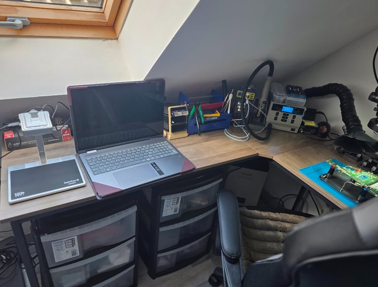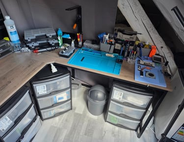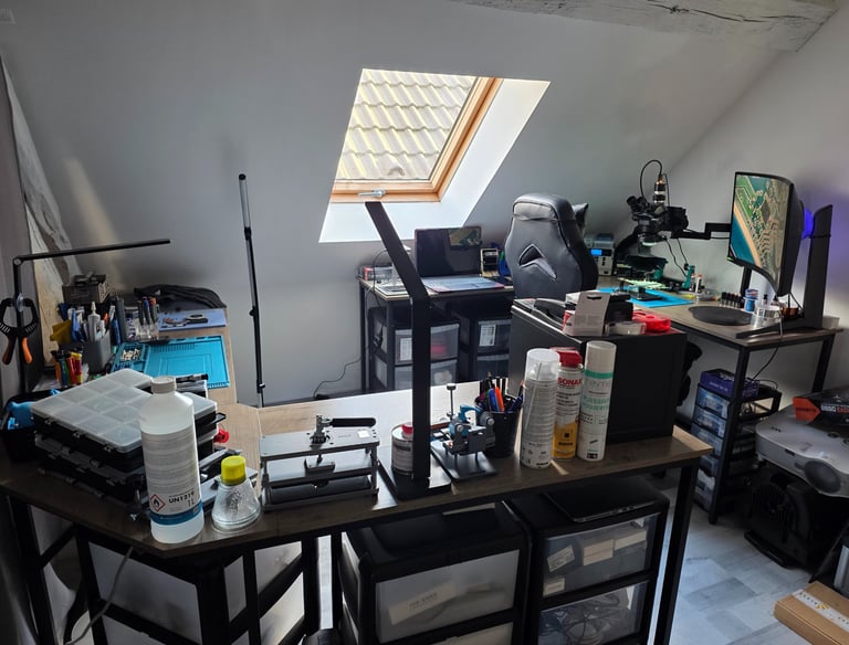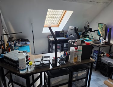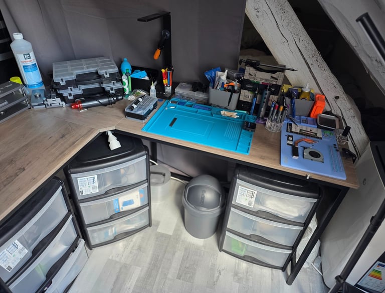 Cet atelier me permet de réaliser des réparations électroniques dans de bonnes conditions, avec un espace dédié pour chaque type d’intervention.