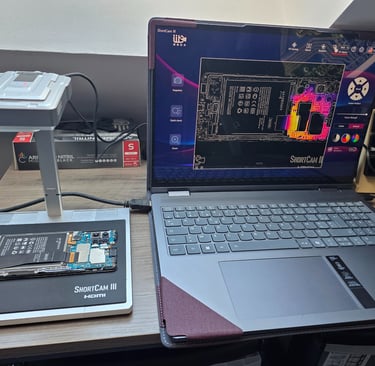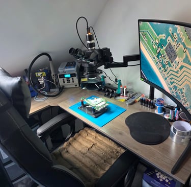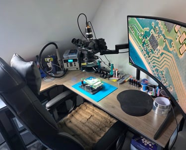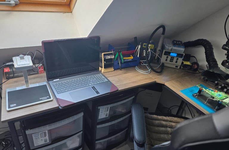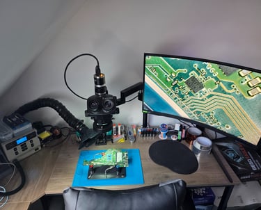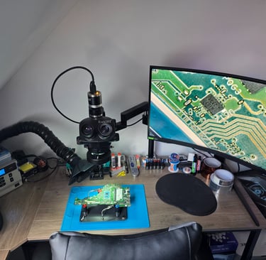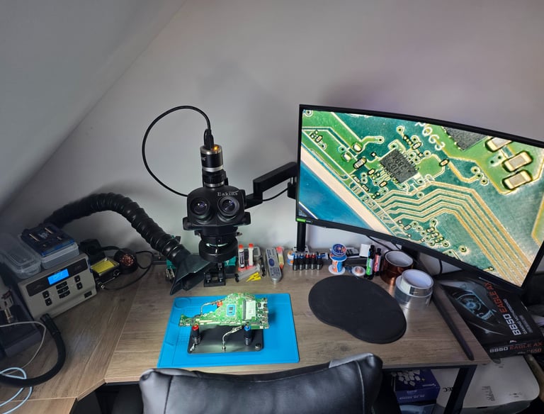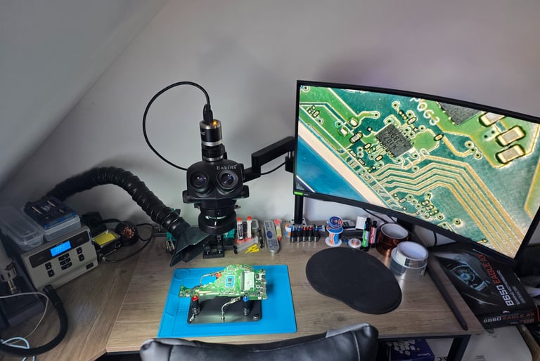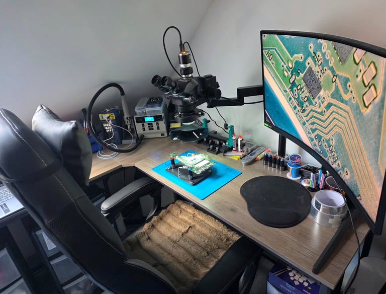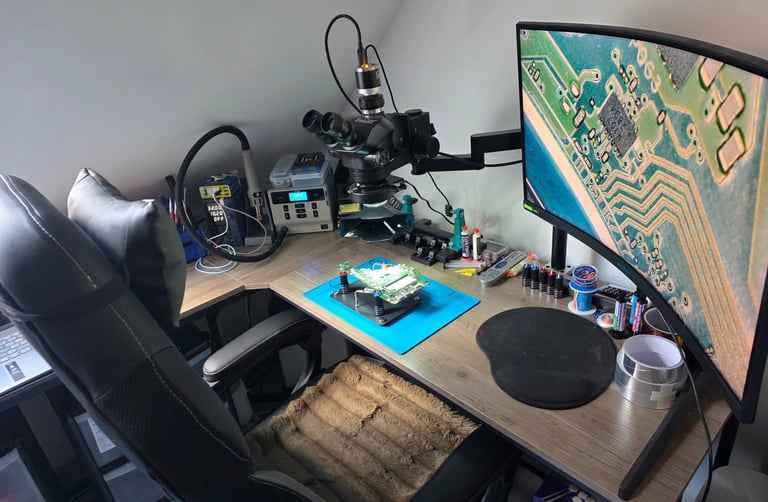 Ce poste de travail me permet de réaliser des réparations électroniques précises, notamment grâce au microscope utilisé pour la micro-soudure et la réparation de carte mère.